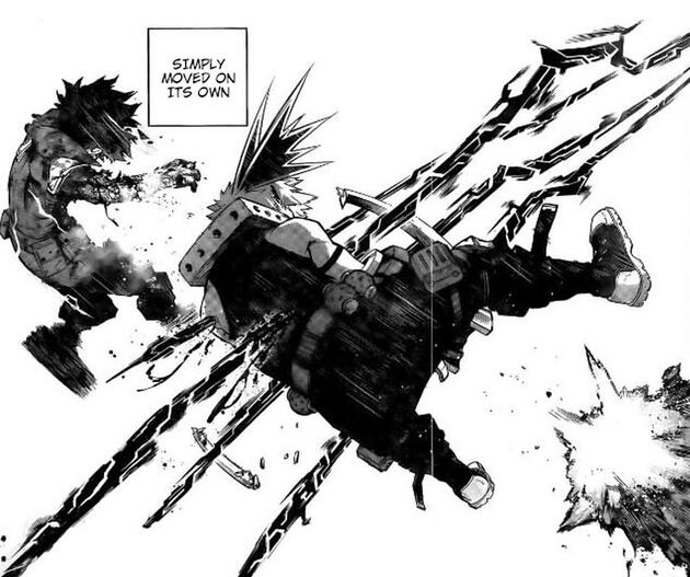 following with him thinking, "but at that moment...without thinking...my body, simply moved on its own." and then, out of nowhere, bakugou jumped out next to deku, where he is stabbed in four different places by shigaraki with the afo tendril.